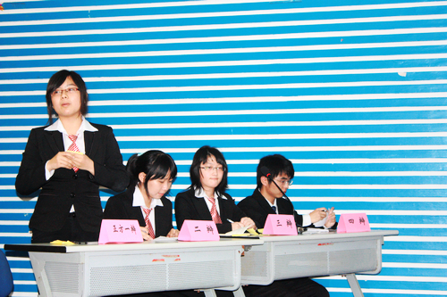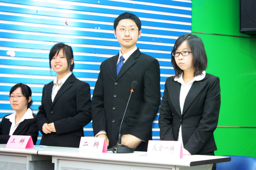 本次决赛的两支队伍分别为09国金3班和09国会2班,他们勇闯重重阻碍来到了决赛的现场。此次辩论赛的辩题也十分的有趣独特——“辩论赛的精彩程度在于辩题还是辩手。”