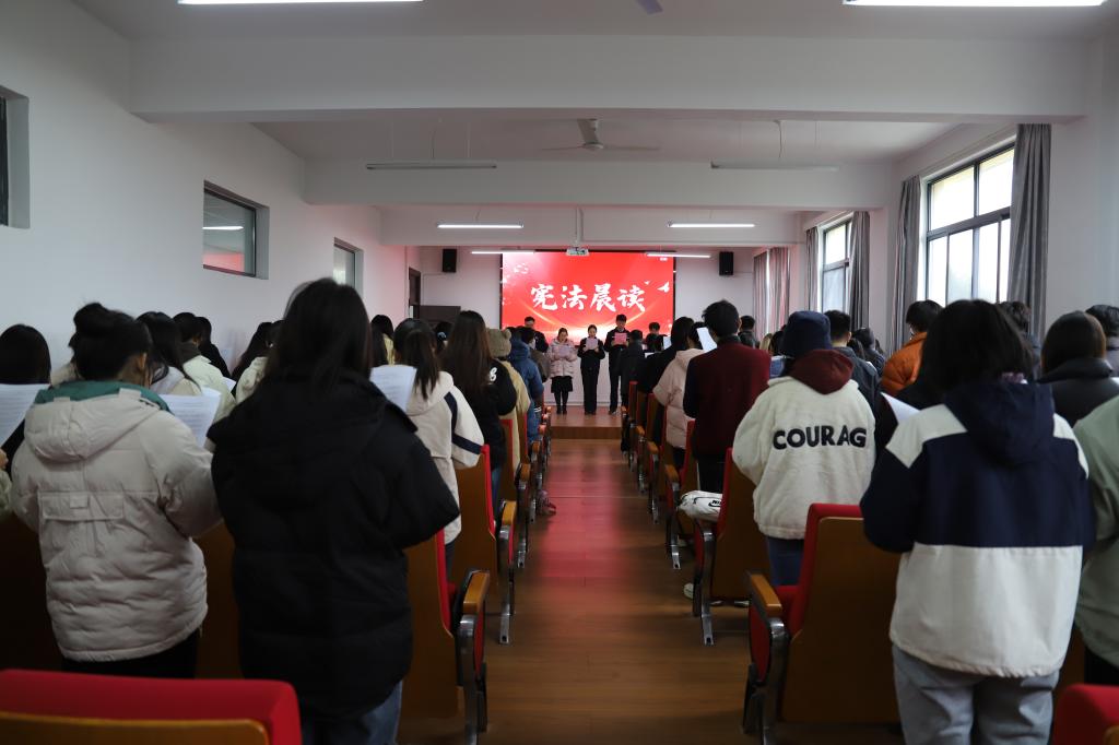 活动现场的党员、团员青年们集体收看了“宪法晨读”活动直播,并由花山区司法局的青年党员们带领同学诵读宪法部分条款,同步参与了宪法晨读活动,所有人精神饱满,情绪激昂,大声诵读,用心体会宪法的庄严与神圣,让宪法的精神内化于心,践行于外,“宪法晨读”活动结束后,会场一起合唱了《宪法伴我们成长》歌曲。