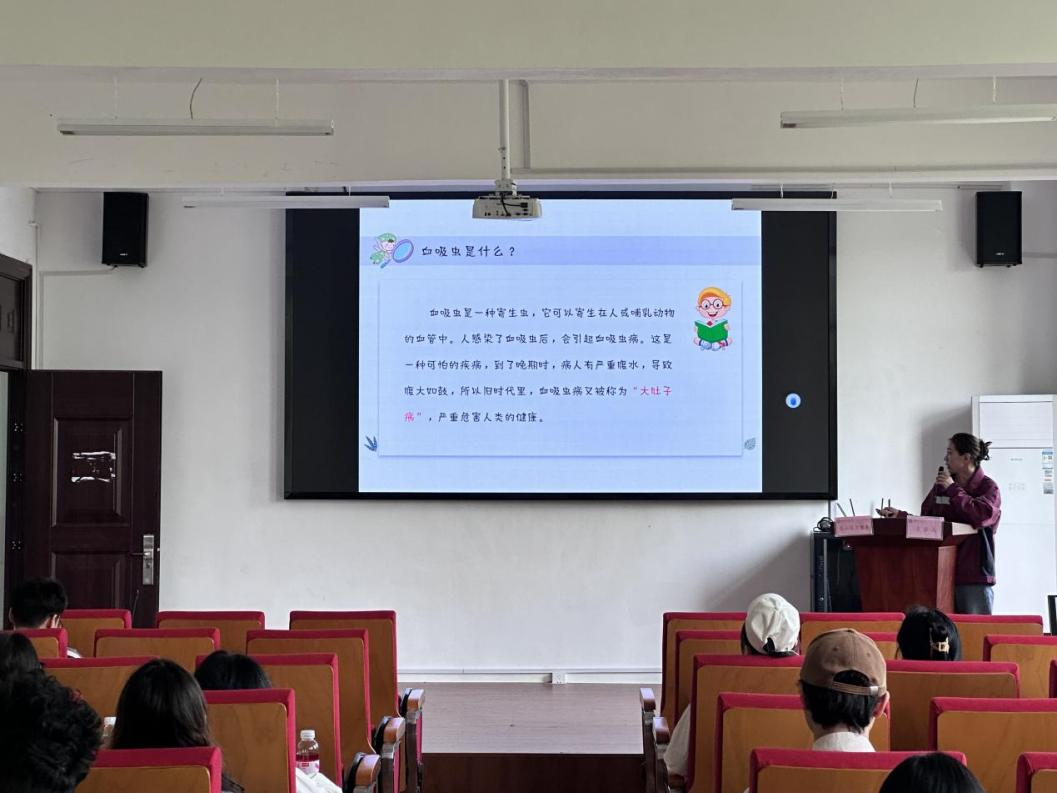 花山区卫健委孙碧君通过实际案例与案发图片,围绕血吸虫病的生活史、传播途径以及感染症状等方面给现场学生做了详细讲解,对同学们在日常生活中如何落实安全卫生和血吸虫防治提出建议,并提醒同学们相应防范事项,鼓励同学们为身边的人多科普血吸虫病的知识。