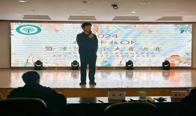 枫叶芳飞,硕果累累,在这个金秋时节,公法学院文艺部于11月8日晚18:00在佳山校区大学生活动中心举办了24级新生卡拉OK暨才艺展示大赛决赛。此次活动邀请了公法学院党委副书记学生工作副院长纪委书记周浩然和团学工作负责人钱前,还有执行主席茆文超、二课部门负责人李京泽、团委副书记魏思竹、心协部门负责人张佳媛、权益部部门负责人张栋梁作为大赛评委,该活动作为大学生课余活动的一部分,不仅在多个方面展示了同学们的个人魅力,还充分体现了校园音乐文化的氛围,同时也展现了我校全体师生团结创新、蓬勃向上的精神面貌。