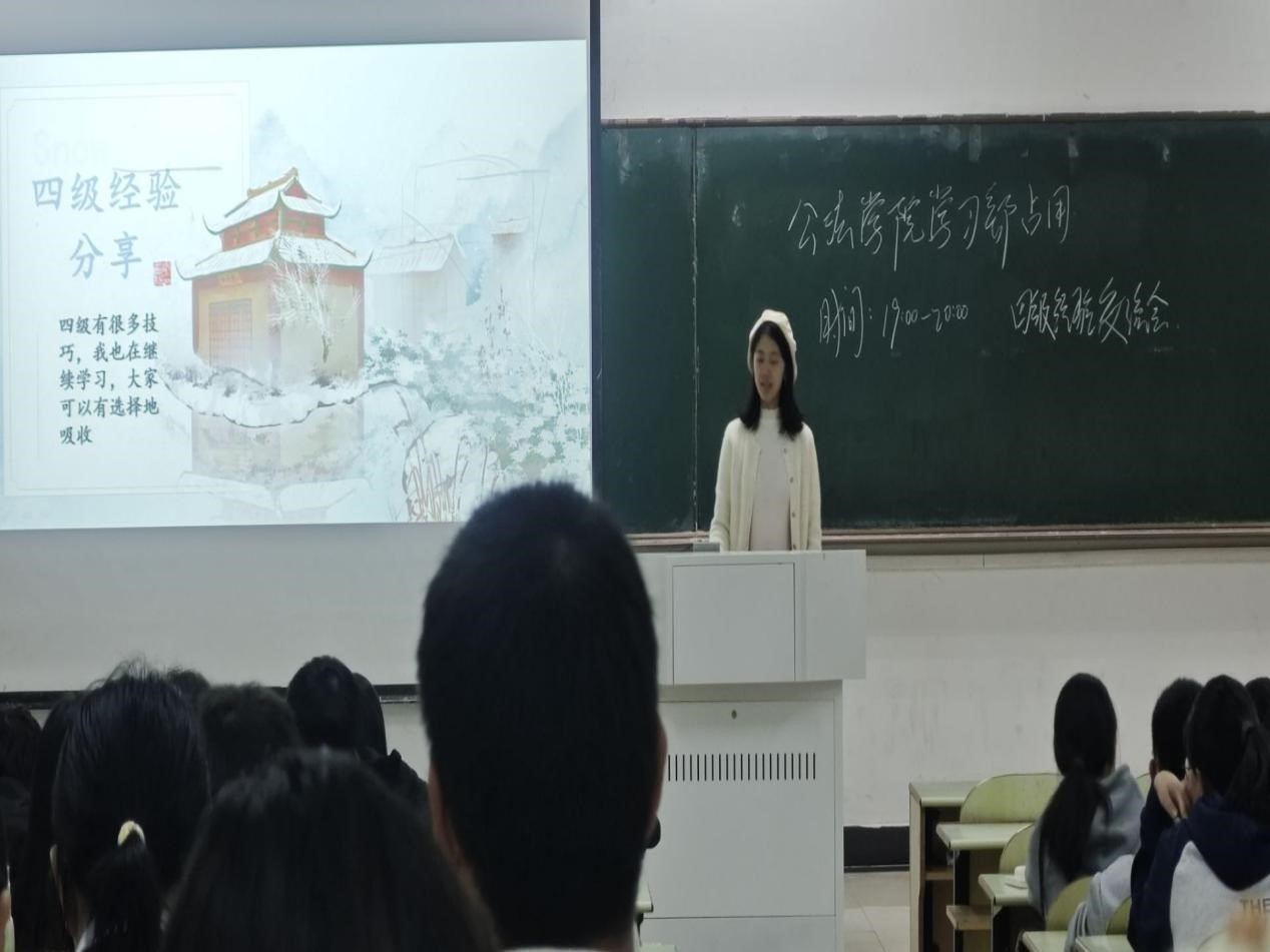 学习部于11月16日晚在第三教学楼南103开展了“四级经验交流会”活动,公法学子们齐聚一堂,认真倾听了于照霖、夏筱玥、 史文晴、范潇宵等优秀公法学子们的宝贵经验分享。