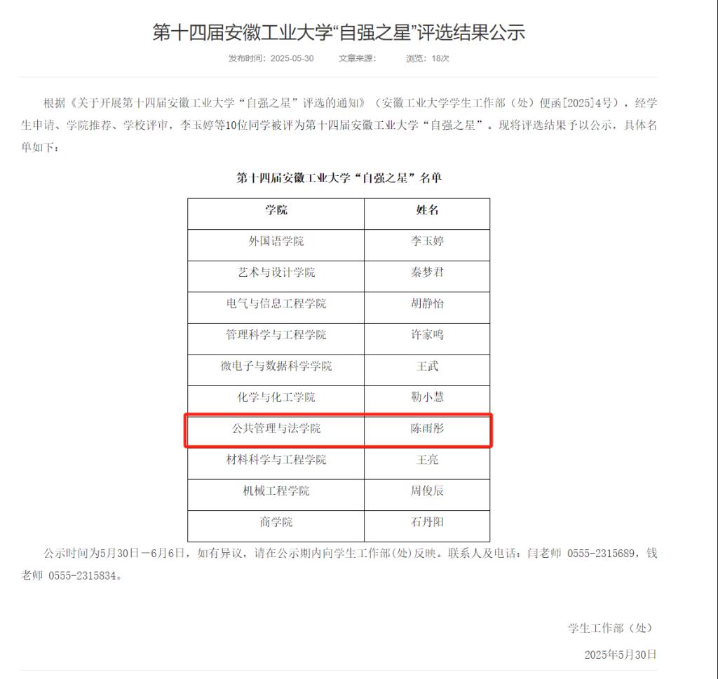 陈雨彤同学凭借坚定的理想信念、优异的综合表现和感人至深的奋斗事迹,荣获第十四届安徽工业大学“自强之星”荣誉称号。