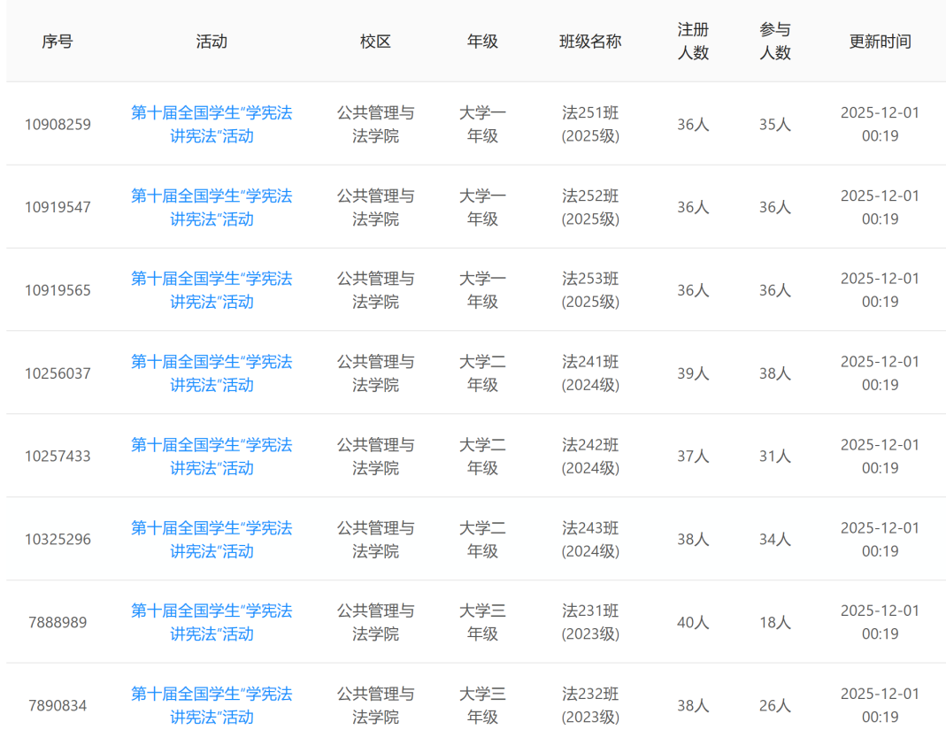 本次活动以线上学习为主要形式,依托教育部全国青少年普法网及对应小程序作为学习平台,内容围绕宪法核心要义设置系列专题学习视频,涵盖宪法的基本内容、发展历程、现实意义等重点内容,确保学习内容权威、系统。活动前期,工作人员发布活动通知与操作指南,在线解答学生登录、学习过程中的各类问题,同时每日统计学习进度、提醒未完成学习的学生,保障活动全程规范有序、覆盖全员。活动期间,同学们参与热情高涨,线上学习完成率显著提升,许多同学在学习后主动分享宪法学习心得,交流对法治精神的理解。