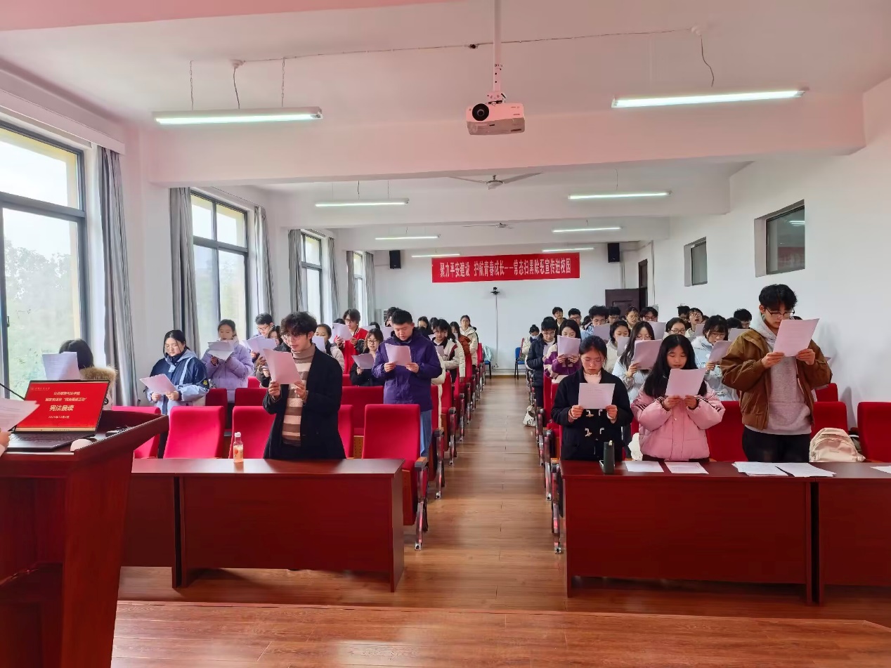 昂扬的国歌奏响完毕,领读人刘淑鑫带领全体与会人员,齐声诵读了《中华人民共和国宪法》部分章节,铿锵有力的诵读声响彻教室,体现了同学们对宪法法律的尊崇与敬畏。合唱环节,领唱人张欢带领全体人员合唱了歌曲《宪法伴我们成长》。悠扬而坚定的歌声,传递出青春学子对宪法的信仰与承诺,将现场氛围推向高潮。