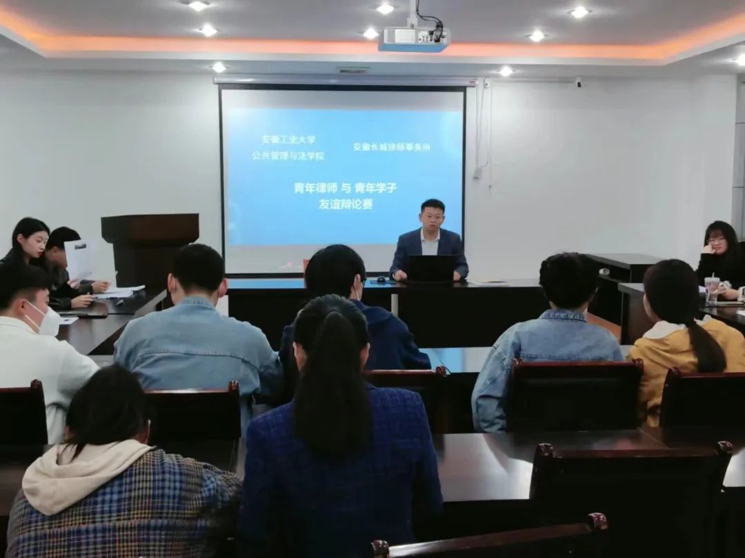 法学系毕业实习生与青年律师的交流,搭建相互学习、促进的平台,2023年4月14日下午,举办“青年律师与青年学子友谊辩论赛”。此次辩论赛以真实案例为辩题,贴合实际,旨在提升辩手的思辨水平和业务能力,安工大学子及安徽长城律师事务所律师近30人参加了此次活动。