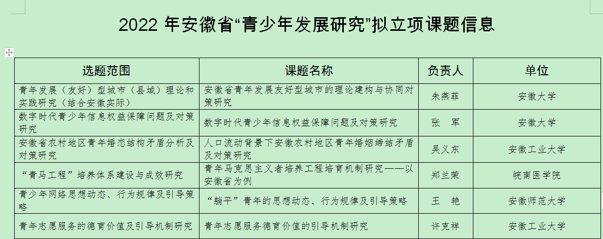 为深入贯彻习近平新时代中国特色社会主义思想,推动《安徽省中长期青年发展规划(2018—2025年)》纵深实施,贯彻安徽省青年工作联席会议精神,加强青少年发展理论和政策研究,提升规划实施科学水平,团省委决定开展2022年安徽省“青少年发展研究”课题申报工作。