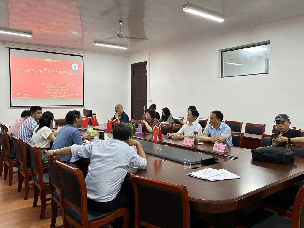 法学人才培养工作、实现法学教育向高质量目标迈进”的总体规划,2023年6月4日,“新文科下法学人才培养经验交流会”于公法楼会议室顺利召开。安徽师范大学法学院副院长李光宇教授、周俊强教授、马鞍山市人民检察院洪明副检察长、马鞍山市中级人民法院赵丽萍法官以及老虎机