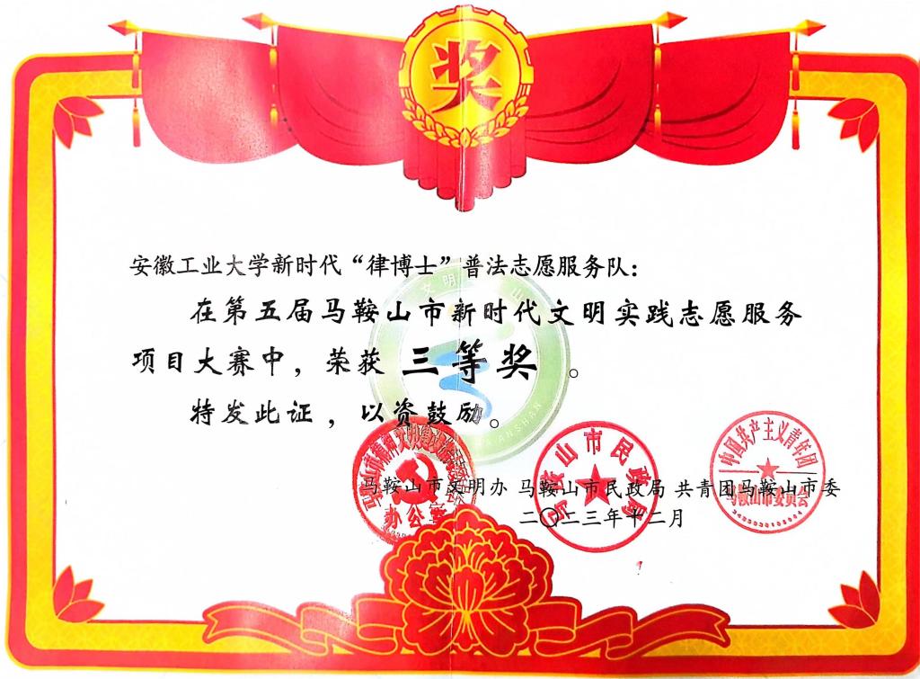 “律博士”普法志愿服务队参加竞赛,“律博士”普法志愿服务队立足于安徽工业大学校级普法宣传平台,以青年力量进行法制宣传教育,不断增强普法宣传面及法治的渗透力,经过项目决赛角逐,“律博士”普法志愿服务队获马鞍山第五届新时代文明实践志愿服务项目大赛三等奖。