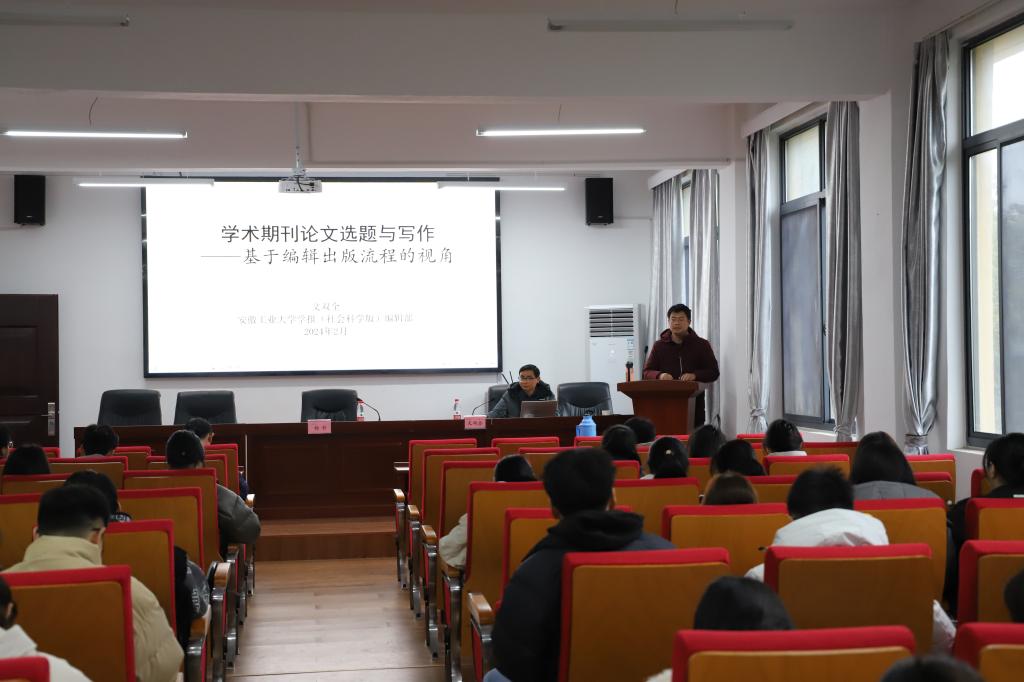 为推进学院一流专业建设和“新文科”创新人才培养,提升学生论文写作能力与发表成功率。3月4日,邀请安徽工业大学学报(社会科学版)编辑部文双全老师主讲《学术期刊论文选题与写作——基于编辑出版流程的视角》,讲座由副院长杨哲主持,一百余位研究生、本科生以及部分老师聆听了讲座。