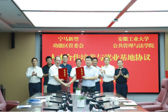 积极实施党建“一融双高”的重要举措之一,9月27日,学院领导班子全体成员陪同校学工部负责人至马鞍山市宁马新型功能区考察调研,并签署人才合作培养与就业基地协议。宁马新型功能区党工委副书记、管委会专职副主任申凯,党工委委员、管委会副主任何耀,博望中安振兴副总经理刘飒,以及宁马新型功能区经济发展局、区域合作局、人才综合服务中心等部门负责人陪同调研和参加签约仪式。