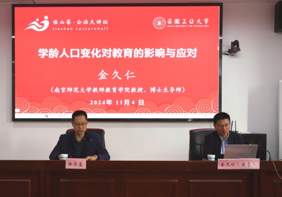 11月4日下午,南京师范大学教师教育学院教授、博士生导师金久仁作客学院“佳山荟・公法大讲坛”活动,为师生们带来一场名为《学龄人口变化对教育的影响与应对》的学术报告。院长徐济益教授主持报告会,副院长杨哲、王务均,雷金火、邵宁、韦子平等老师参加报告会,全体研究生、创新班本科生、公共事业管理专业2023级本科生共同聆听报告。
