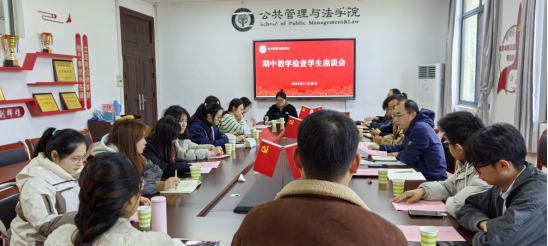 在公法楼402会议室召开期中教学检查学生座谈会。院党委副书记、副院长周浩然,副院长王务均,院团委负责人钱前,院教学秘书夏静以及2022级、2024级各专业学生代表和学生干部代表参加了座谈会。副院长王务均主持座谈会。