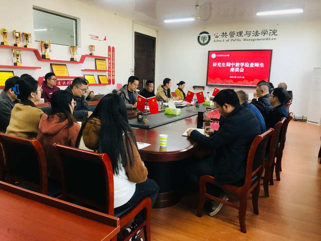 在公法楼402会议室召开研究生期中教学检查师生座谈会。院党委书记胡正友,院长徐济益,正处级组织员江文丽,院党委副书记、副院长周浩然,各研究生学科点负责人,教学秘书,研究生辅导员,研究生导师代表及研究生代表参加座谈会。徐济益主持座谈会。
