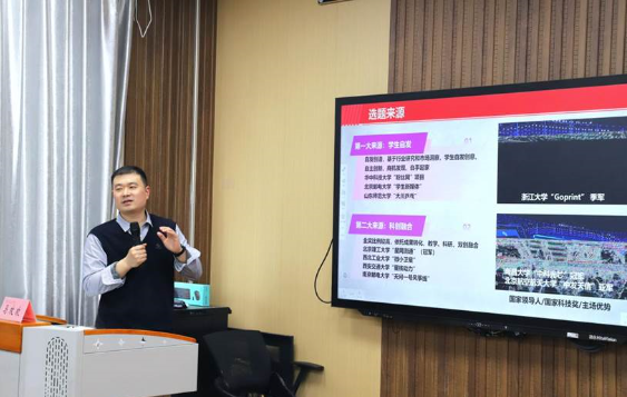 会上,马欢欢首先对中国国际大学生创新大赛的背景、意义、赛制等情况进行了详细介绍,并强调大赛对于提升学生创新实践能力、促进学校创新创业教育发展的重要性。接着,他从创新维度、团队维度、商业维度、教育维度和社会价值维度五大方面解读了竞赛赛道的核心要素,并结合我校特色和学科优势,系统梳理了不同专业背景下的参赛赛道选择策略。他还围绕PPT制作、项目路演、团队组建等关键环节展开讲解,并结合历年金奖作品剖析优秀项目的共性特征与创新突破路径。
