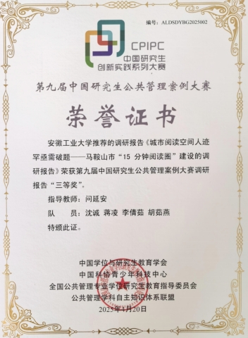第九届中国研究生公共管理案例大赛于2024年12月启动,共有全国268所院校的3115支队伍报名参赛,参赛师生1.53万人,2616篇案例通过文本检查。根据获奖名单,由公法学院问延安老师指导,2024级MPA在读研究生沈诚、蒋凌、李倩茹、胡茹燕组成的“如心诚则必灵”队所提交的调研报告荣获本次大赛三等奖,这是公法学院自组队参加该项大赛以来首次获得调研报告三等奖。这次获奖,也是公法学院坚持高质量建设MPA学位点的标志性成果之一。公法学院历来重视培养MPA研究生“经世致用”能力,以此次获奖为新的起点,继续积极组织MPA学生参赛,争取下一届在参赛案例数量和获奖等次方面都能再上一个新的台阶。(撰稿:问延安 审核:周彩霞,杨哲)