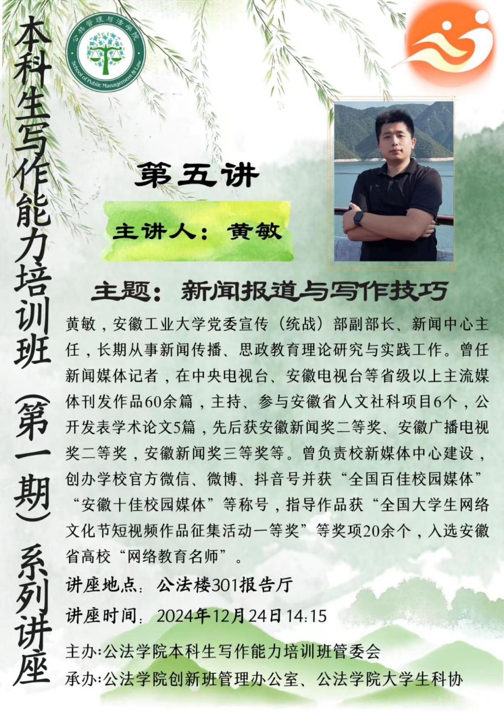 主讲人简介:黄敏,安徽工业大学党委宣传(统战)部副部长、老虎机主任,长期从事新闻传播、思政教育理论研究与实践工作。曾任新闻媒体记者,在中央电视台、安徽电视台等省级以上主流媒体刊发作品60余篇,主持、参与安徽省人文社科项目6个,公开发表学术论文5篇,先后获安徽新闻奖二等奖、安徽广播电视奖二等奖,安徽新闻奖三等奖等。曾负责校新媒体中心建设,创办学校官方微信、微博、抖音号并获“全国百佳校园媒体”“安徽十佳校园媒体”等称号,指导作品获“全国大学生网络文化节短视频作品征集活动一等奖”等奖项20余个,入选安徽省高校“网络教育名师”。