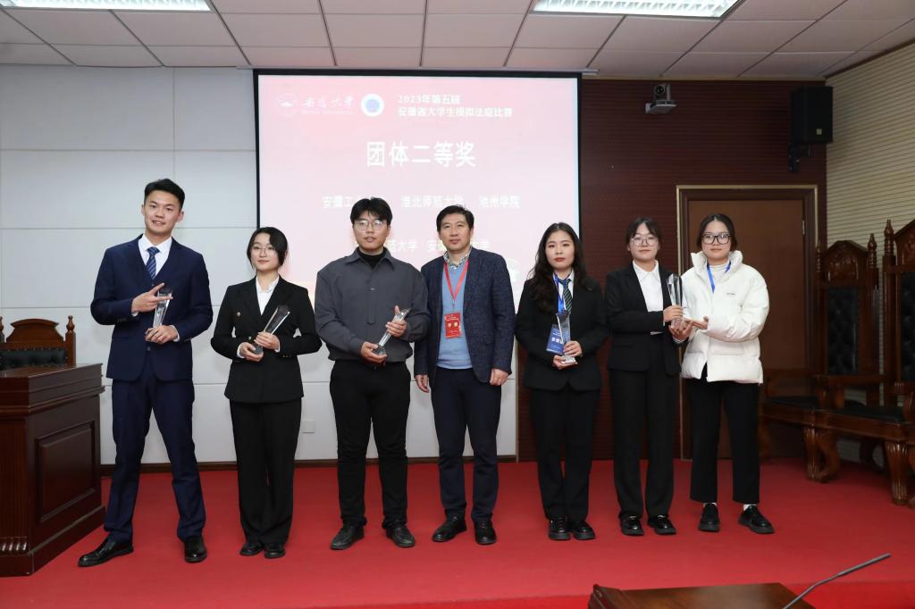 安徽省大学生模拟法庭比赛为安徽省高校学科技能B类竞赛,参赛单位为安徽省内开设法学教育专业的高校,参赛学生为全日制法学专业本科生。2023年参赛队伍为安徽大学、合肥工业大学、安徽工业大学、安徽财经大学、安徽工程大学、安徽建筑大学、安徽农业大学、安徽师范大学、安徽医科大学等全省21所高校。赛事以贴近法律实务培养学生实践能力为基本方向,评委由省内资深法官、检察官、律师和教师组成。比赛内容由书状和法庭辩论两部分组成。通过该项赛事,将法学教育与法律实务沟通起来,同时也为法律实务部门参与卓越法律人才培养提供合适的渠道。本项赛事因疫情停办了3年,今年恢复举办。本次安徽工业大学公法学院代表队获安徽省二等奖,这是继2019年安徽工业大学代表队获得最佳书状奖之后,在此项赛事中获得的又一好成绩!