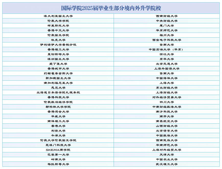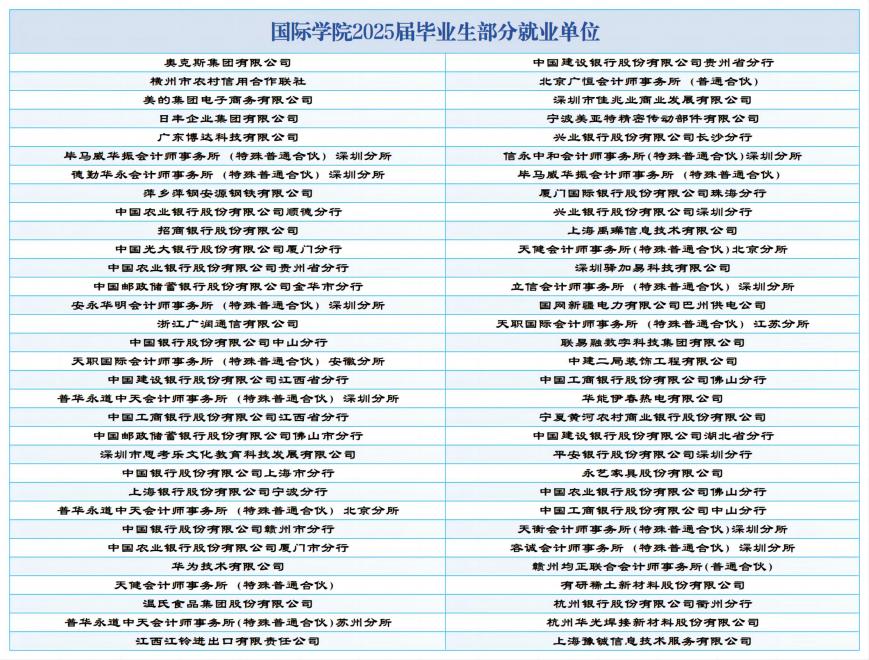 老虎机 2025届毕业生有近40%的学生国内升学、出国(境)交流或交换学习,或留学攻读硕士、博士学位;45%左右的学生在国内外从事金融服务业或进驻商务领域。他们当中,有直接就业于华为、美的、普华永道、德勤等世界知名跨国公司,有任职于国家外交部、税务总局等国家公务员岗位;有进入牛津大学、哥伦比亚大学等全球顶尖名校学习,有考取浙江大学、厦门大学、中央财经大学、上海财经大学等国内著名高校继续深造。