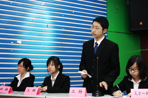 本次决赛的两支队伍分别为09国金3班和09国会2班,他们勇闯重重阻碍来到了决赛的现场。此次辩论赛的辩题也十分的有趣独特——“辩论赛的精彩程度在于辩题还是辩手。”